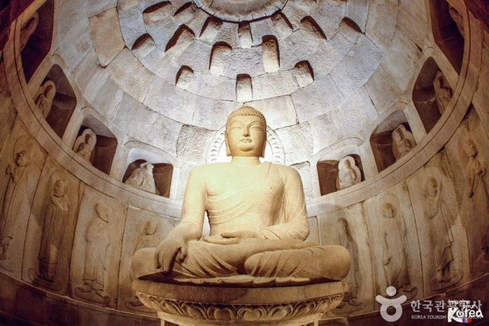 석굴암(국보)은 신라 경덕왕 10년에 당시의 재상인 김대성에 의해 창건되었다고 전해진다. 불국사에서 산등성이를 타고 등산로로 3km, 신도로로는 9km거리에 있는 석굴암의 구조는 방형과 원형, 직선과 곡선,평면과 구면이 조화를 이루며 특히, 벽 주위에 조각된 38체는 어느 것 하나 걸작이 아닌 것이 없고 전체적인 조화를 통해 고도의 철학성과 과학적인 면모를 나타내고 있으며 중앙에는 백색 화강암으로된 여래좌상의 본존불이 동해를 굽어보고 있다. (자료출처 : 대한민국 구석구석 - korean.visitkorea.or.kr) 위치 : 펜션에서 차량으로 약 26분, 차량으로 22.3km